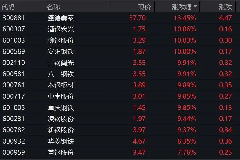 钢铁股早间也放量高开高走,板块指数盘中一度大涨逾5%,开盘不到1小时成交就超前一交易日全天成交。板块内所有个股上涨,酒钢宏兴、柳钢股份、安阳钢铁、新钢股份等涨停。