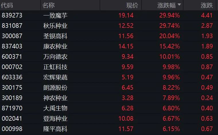 细分种业股领涨市场,板块指数放量飙升9.92%,突破10月8日高点,并逼近年内最高点,半日成交超前一交易日全天成交。板块内所有个股飘红,万向德农等涨停。土地流转、预制菜、乡村振兴、水产品等板块也纷纷大涨,润农节水30%涨停,宏辉果蔬等批量涨停。