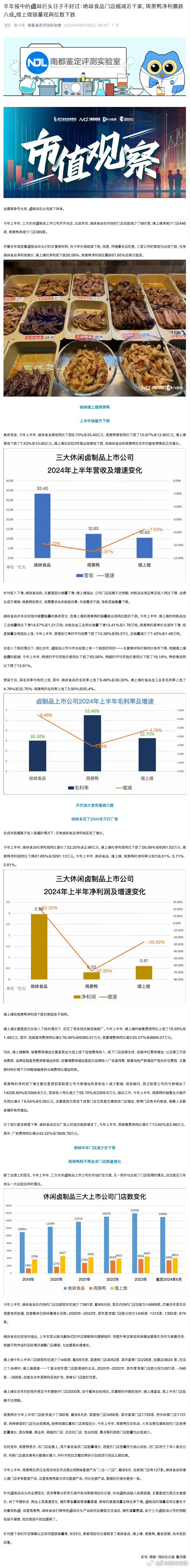 【#卤味为什么卖不动了#?绝味食品门店缩减近千家,#周黑鸭净利暴跌六成#,煌上煌销量现两位数下跌】今年上半年,三大休闲卤制品上市公司齐齐关店,比起年初,绝味食品在内地的门店总数减少了981家,煌上煌净减少门店445家,周黑鸭净减少门店360家。尽管去年困扰着卤制品巨头们的主要原材料,在今年价格明显下跌,但是,伴随着关店的是,三家公司的营收均出现下跌,仅有绝味食品净利润增长,煌上煌的净利润下跌26.59%,周黑鸭净利润在暴跌67.65%后再次垫底。(南都)
